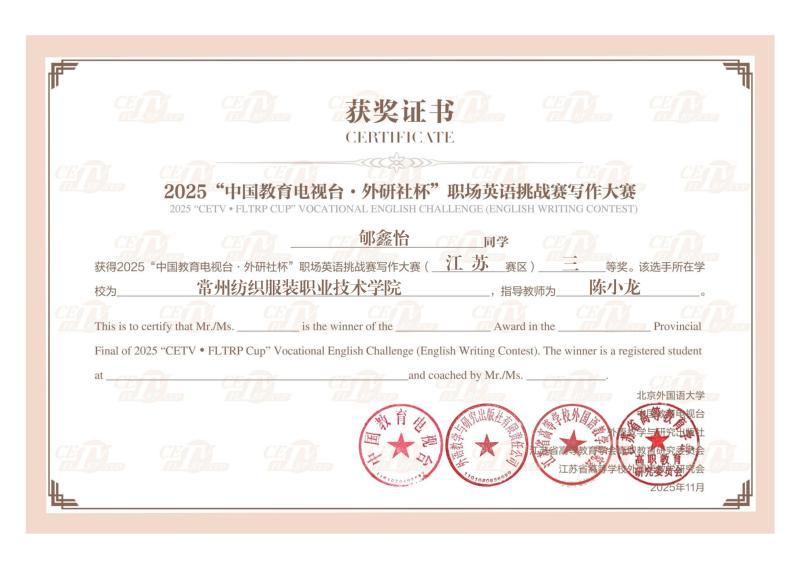近日,2025年“中国教育电视台·外研社杯”职场英语挑战赛(江苏赛区)在南京圆满落幕。本届赛事以“Future Industry,Future Me”为主题,设置写作与演讲两大核心赛道,吸引全省60多所高职院校选手同台竞技,展示了一场高水准的职场英语盛宴。